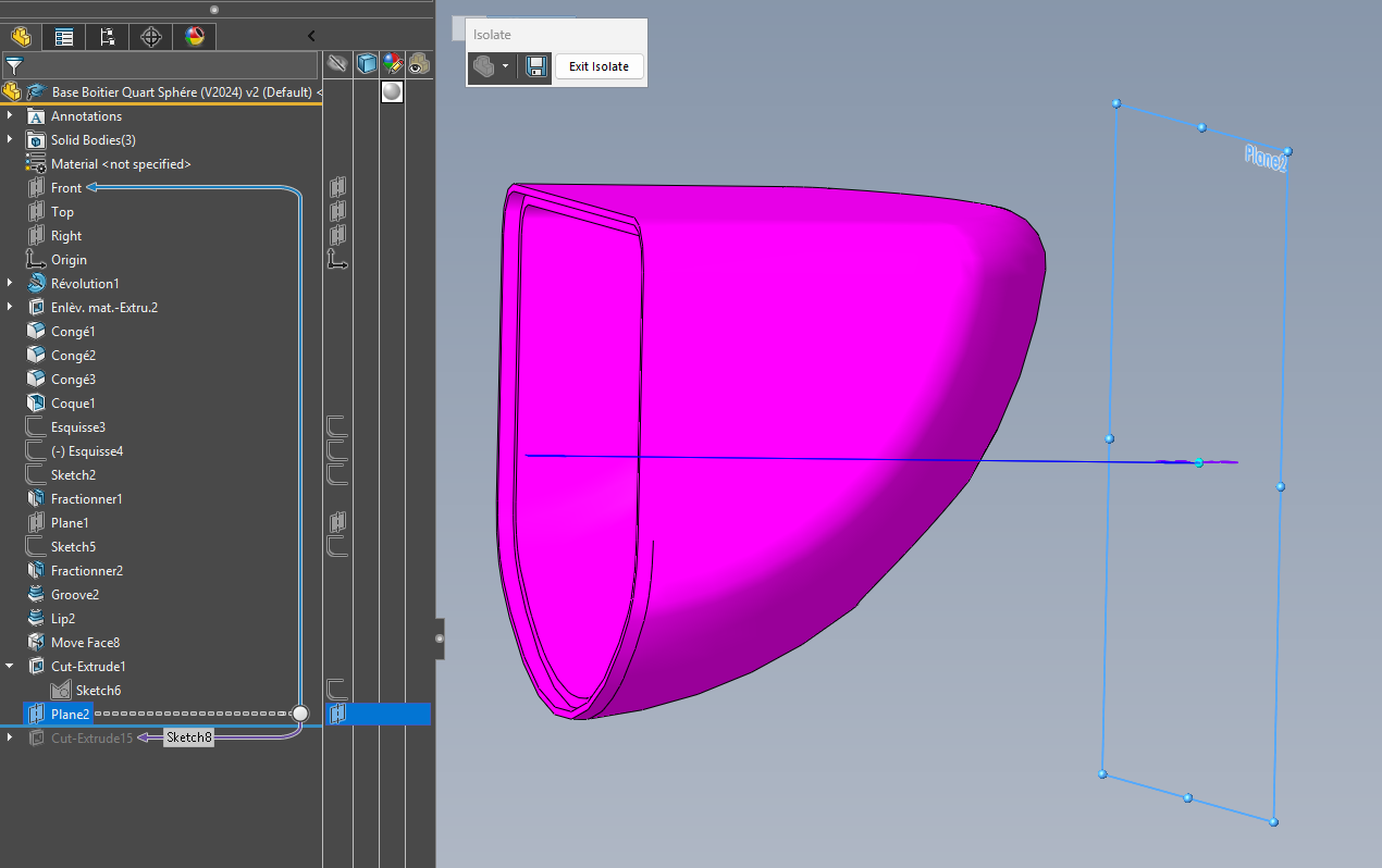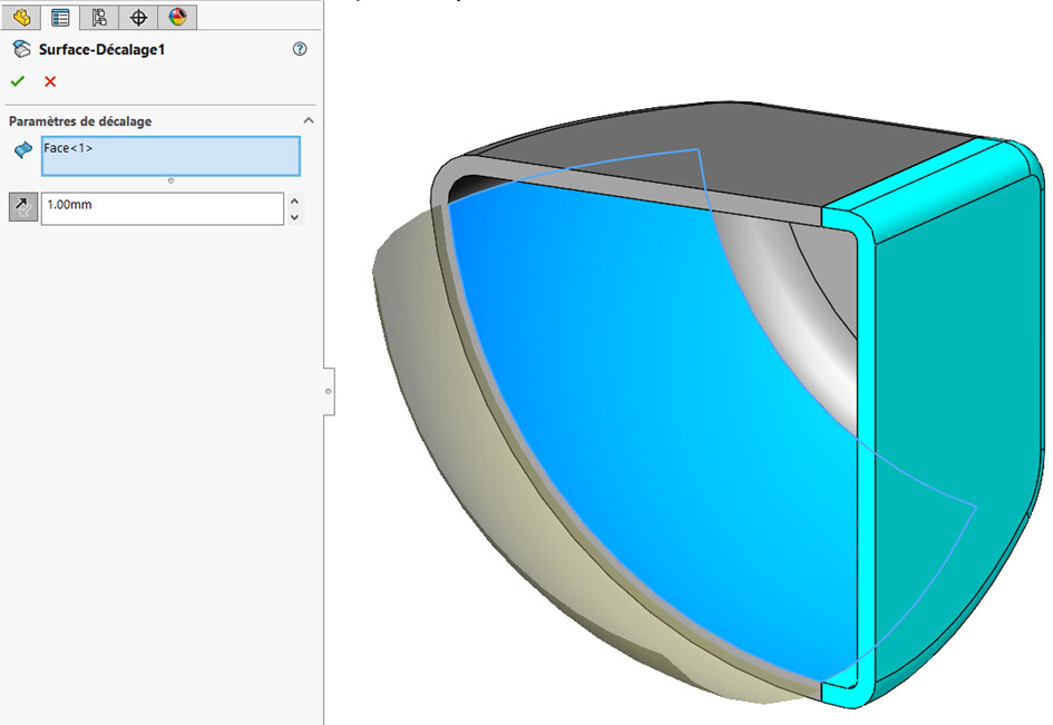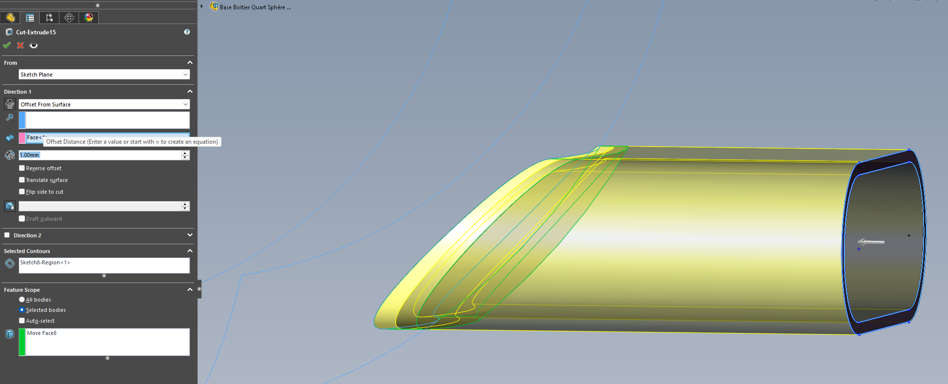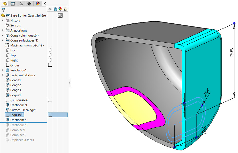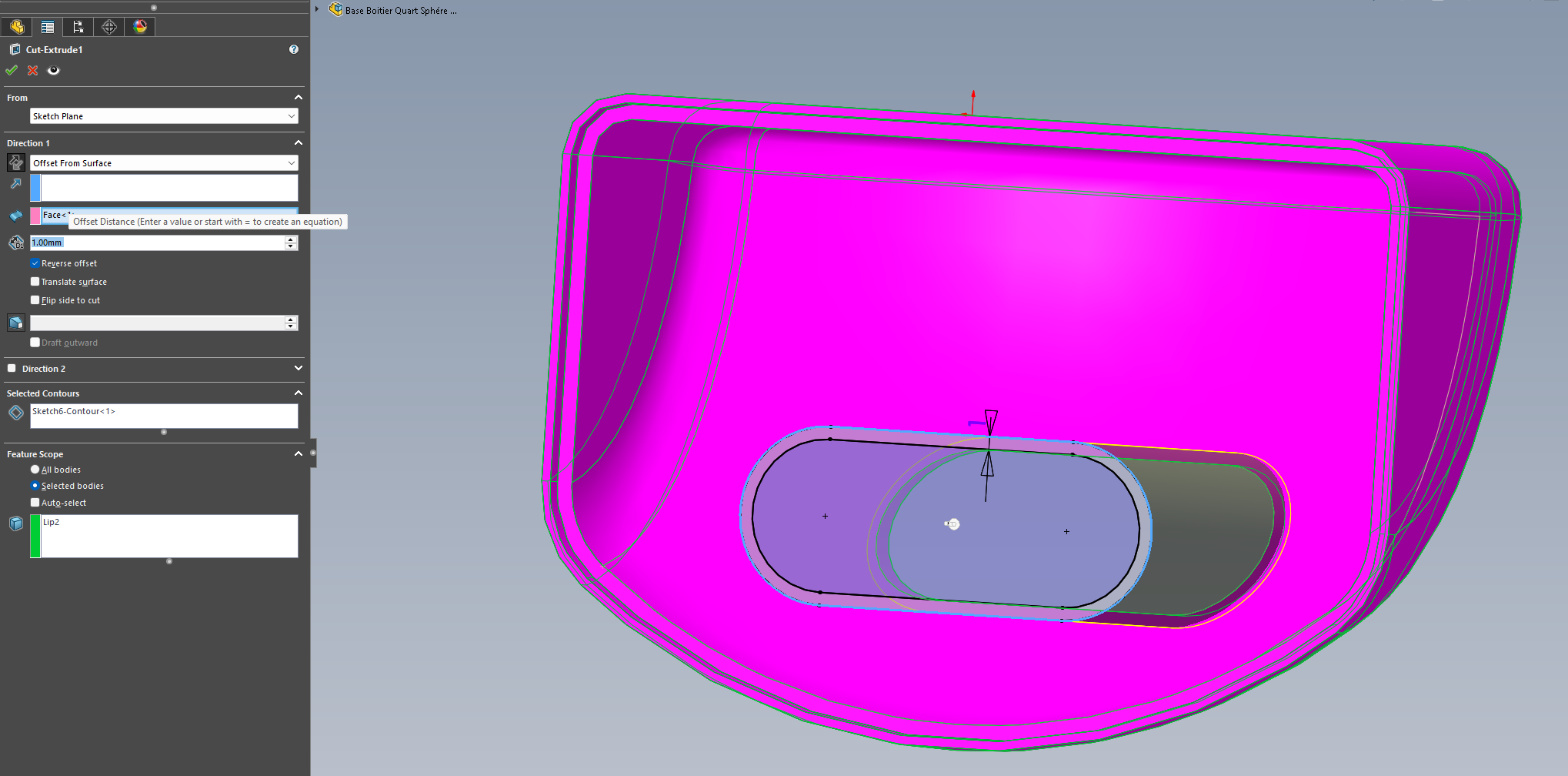 Dzielenie poprzedniego fioletowego konturu przez odsuniętą powierzchnię wewnętrzną: