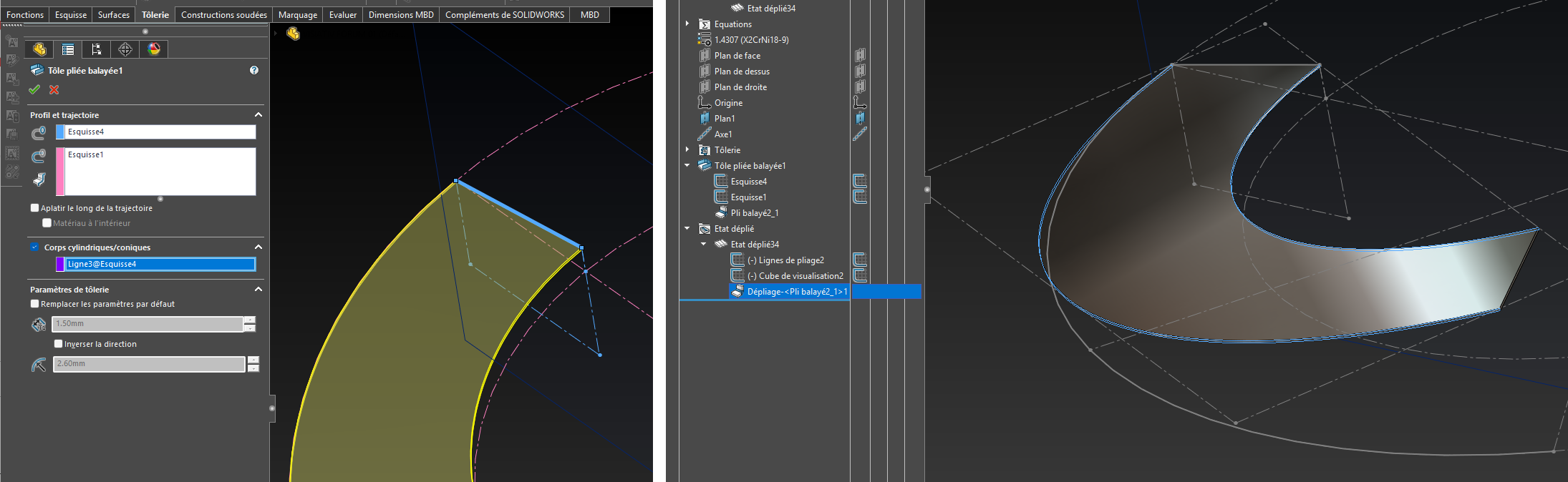 La génération par la fonction « Tôle pliée balayée » propose une option nommée « Corps cylindriques/coniques », apparemment indispensable pour obtenir un déplié correct.