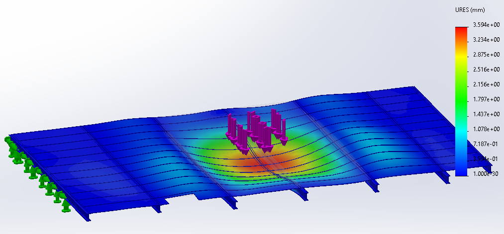 En passant tout en volumique, avec l’option de maillage « basé sur la courbure », et une charge en partie centrale du plateau, la simulation statique se déroule sans problème (SW 2022) sur les deux modèles.