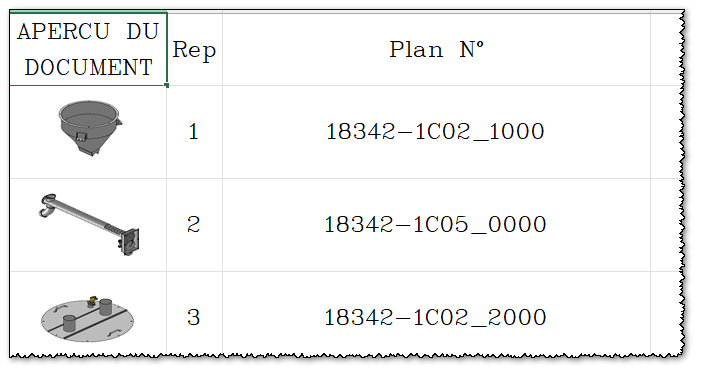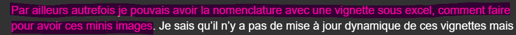 Par ailleurs autrefois je pouvais avoir la nomenclature avec une vignette sous excel, comment faire pour avoir ces minis images. Je sais qu’il n’y a pas de mise à jour dynamique de ces vignettes mais pour l’envoi des fichiers au sous traitants c’est plus facile pour dialoguer à la réception.
