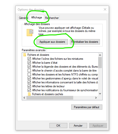 Ensuite dans la fenêtre option des dossiers, aller sur l’onglet Affichage puis cliquer sur appliquer aux dossiers (ça va appliquer à l’ensemble des dossiers du coffre).