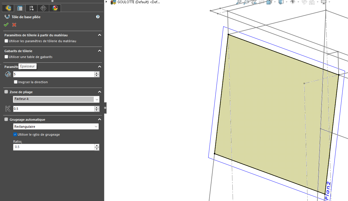 Dans un second temps, les pièces sont créées dans un assemblage, exclusivement avec les fonctions de tôlerie de Solidworks.