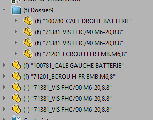 Je souhaiterais savoir si l’un d’entre vous saurait s’il est possible d’utiliser la fonction grouper les occurrences de composant dans l’arbre d’un assemblage tout en conservant une structure de rangement par dossier? C’est à daire que si j’ai 10 écrous en vrac dans l’arbre, SW les regroupe dans un groupement d’occurrence écrou, et si j’ai 5 écrous et 5 vis dans un dossier visserie, il me fait deux regroupements dans ce meme dossier (un de 5 vis et l’autre de 5 ecrous)