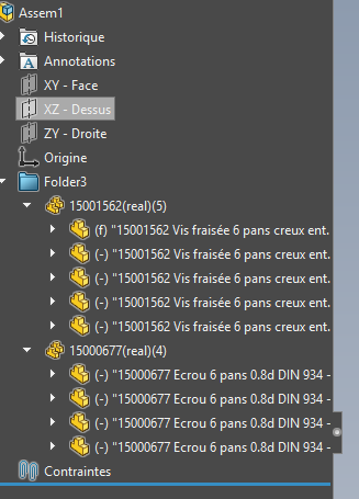 Si toutes les instances de vis et d’écrous sont dans le dossier, les regroupements de vis et d’écrous devrait logiquement resté dans le dossier (sous-dossier vis, sous-dossier écrou) :