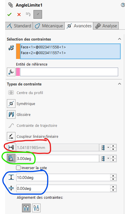 Pour les angles c’est identique mais au lieu de mettre une valeur de distance (en rouge ci dessous) il faut mettre une valeur d’angle (en vert ci dessous). les limites sont dans les 2 cas à mettre dans les champs entourés en bleu ci-dessous.
