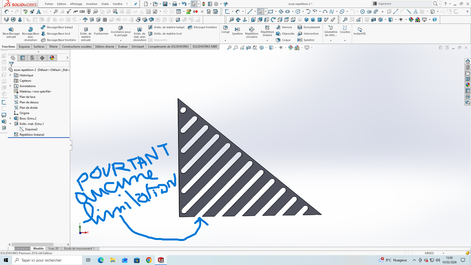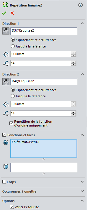 Puis décomposer la répétition linéaire en 1 répétition Verticale avec comme direction la cote de distance à respecter (Distance mini entre découpe et le bord du solide).