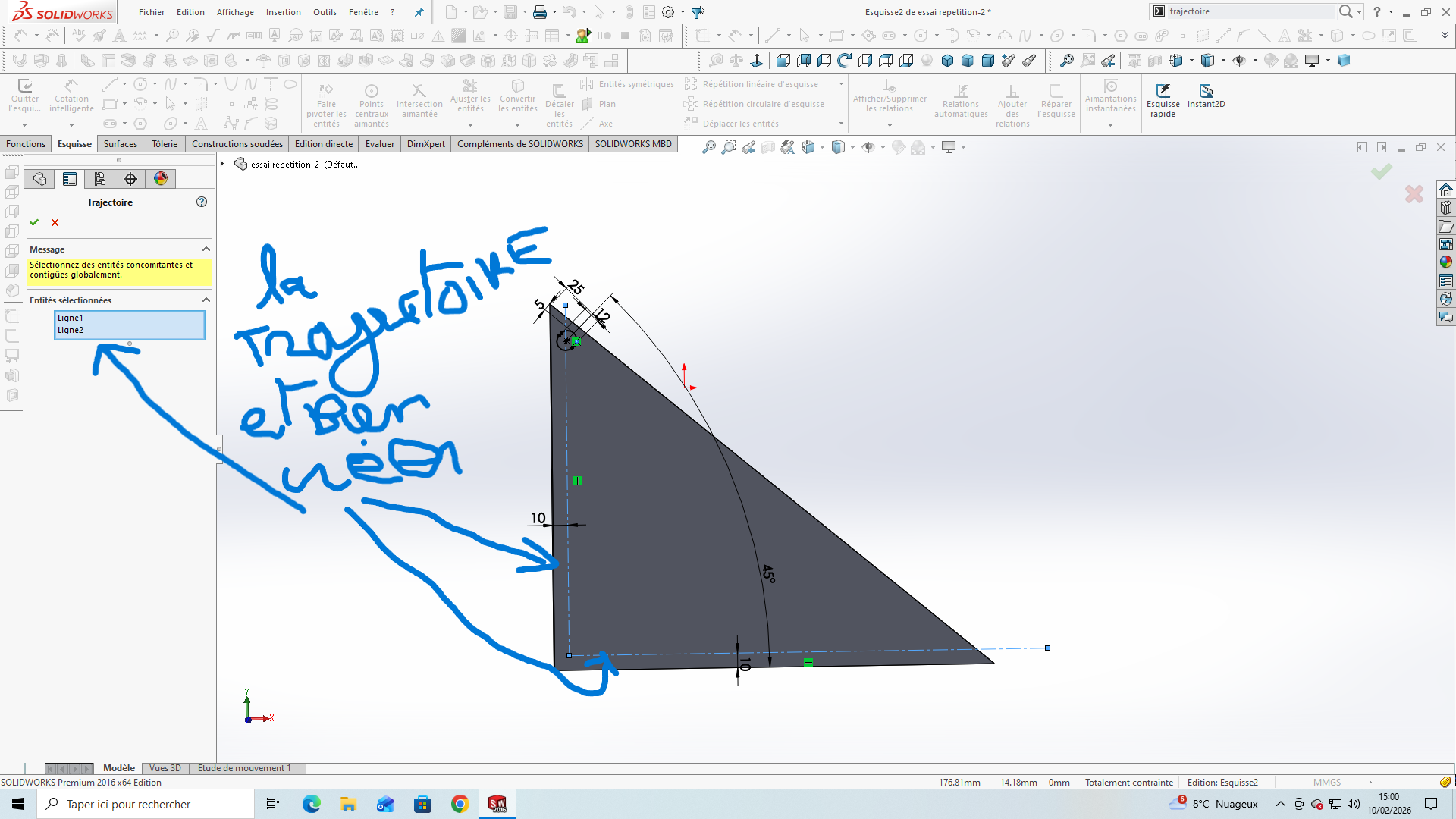 Pour ma part je pense qu’il faut fermer ton esquisse de trajectoire.