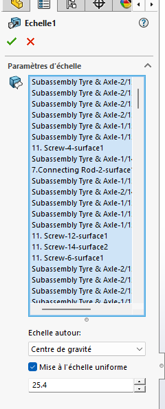 Autre possibilité : ouvrir les pièces de l’assemblage une à une, et appliquer le facteur d’échelle à chacune. C’est plus long, mais l’assemblage est préservé.