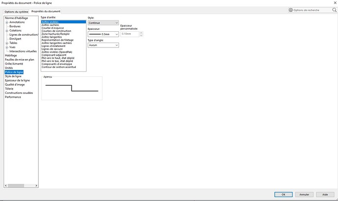 Ok(moi ça fait depuis la première version de solid en 1995), alors c’est exactement au même endroit et faire la même manipulation, c’est dans les options « habillages puis Style le ligne »=>2022 SolidWorks - Epaisseur et style de ligne personnalisés.