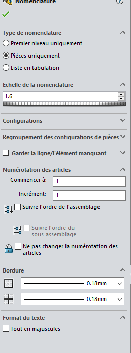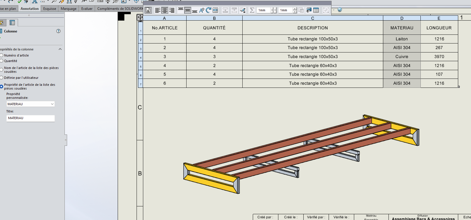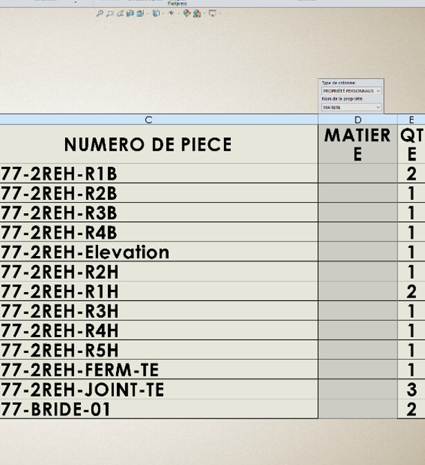 Nous réalisons ensuite un tableau de matières, mais la matière des pièces n’est pas récupérée automatiquement par SolidWorks. Pouvez-vous m’aider ?