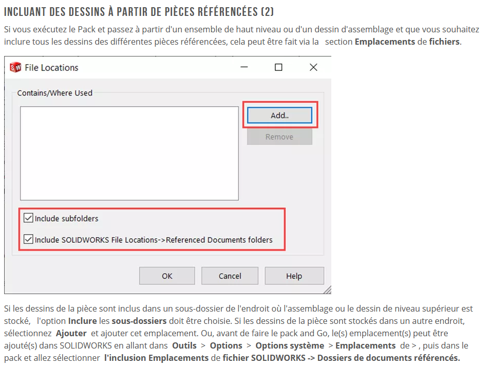 Inclure les mises en plan Ajoutez les mises en plan associées dans les dossiers du modèle ou dans les Chemins de recherche spécifiés à partir de Emplacements des fichiers dans la boîte de dialogue Options du système.