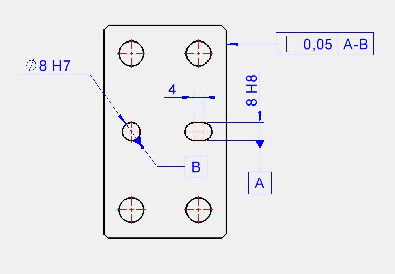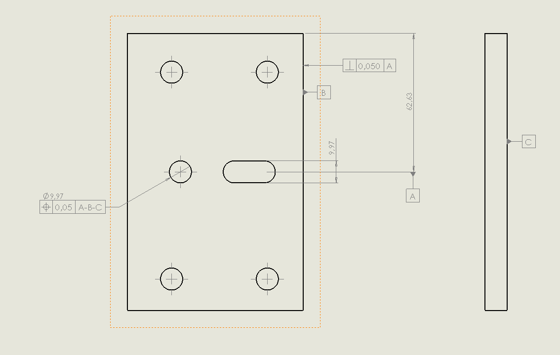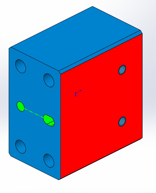 Nous avons eu plusieurs pièces pour lesquelles nous n’avons pas su comment coter, la dernière en date est une pièce parallépipedique qui est mise en position par une goupille + une rainure puis vissée (très classique jusqu’ici, voir en vert ci dessous les logements de goupilles). Nous avons besoin que la face en rouge ci dessous soit perpendiculaire à l’axe virtuel passant par le centre des deux logements (axe vert)