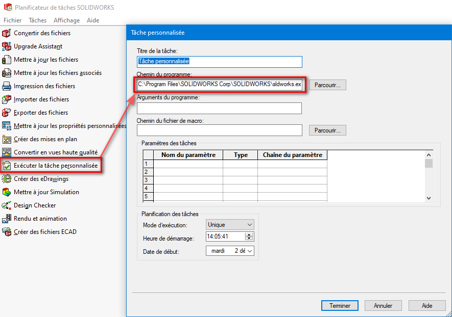 Il y a aussi un planificateur de tâche dans Solidworks. avec les tâches ‹ executer une tache personnalisée › et ‹ exporter des fichiers ›.