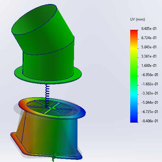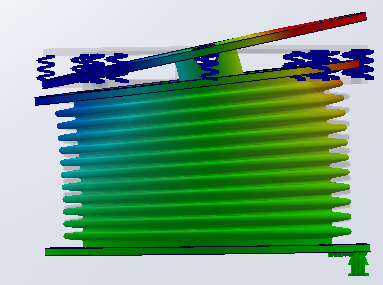 Sur l’illustration ci-dessous, j’ai installé un connecteur ressort possédant seulement une raideur axiale entre deux faces parallèles, l’une sur le compensateur, l’autre sur un composant rigide placé au dessus, auquel est imposé un basculement d’environ 1 degré.