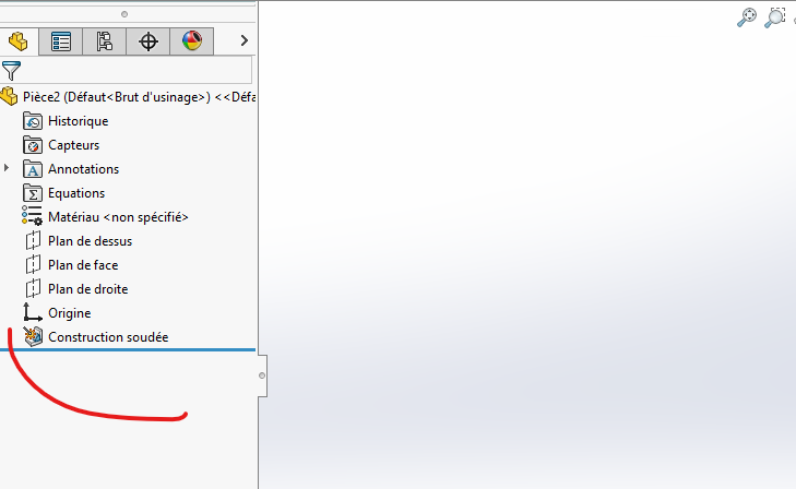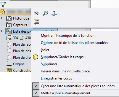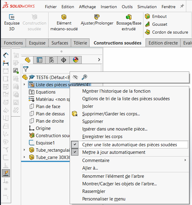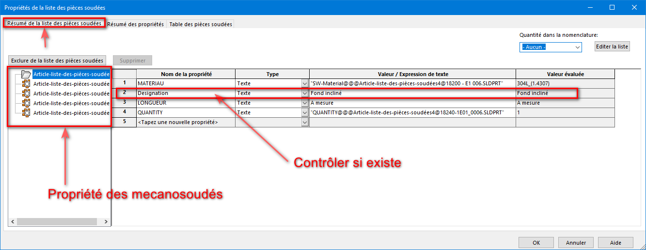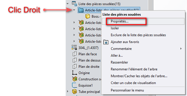 Pour voir si la propriété « Description » existe bien dans le mecanosoudé, faire un clic droit sur un élément de la liste des pièces soudées => Propriété…