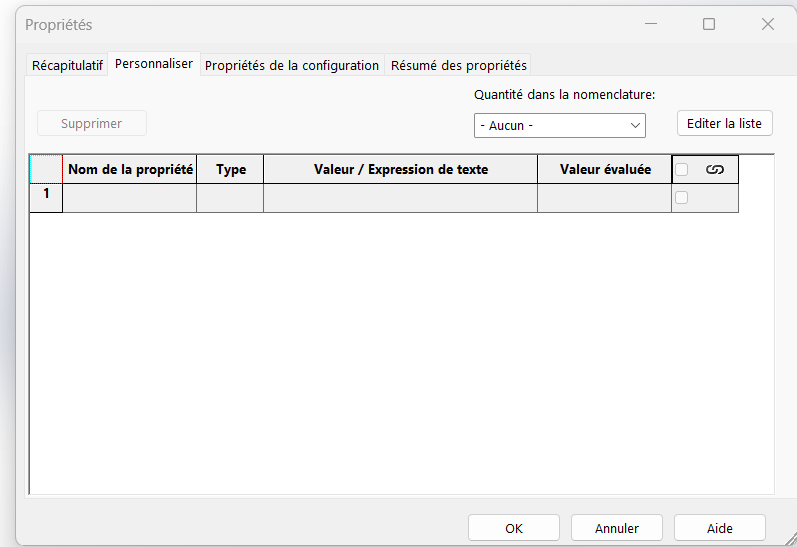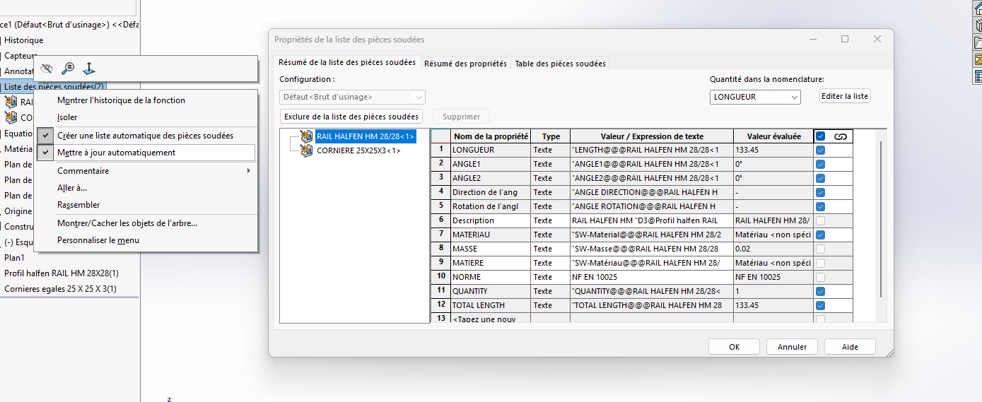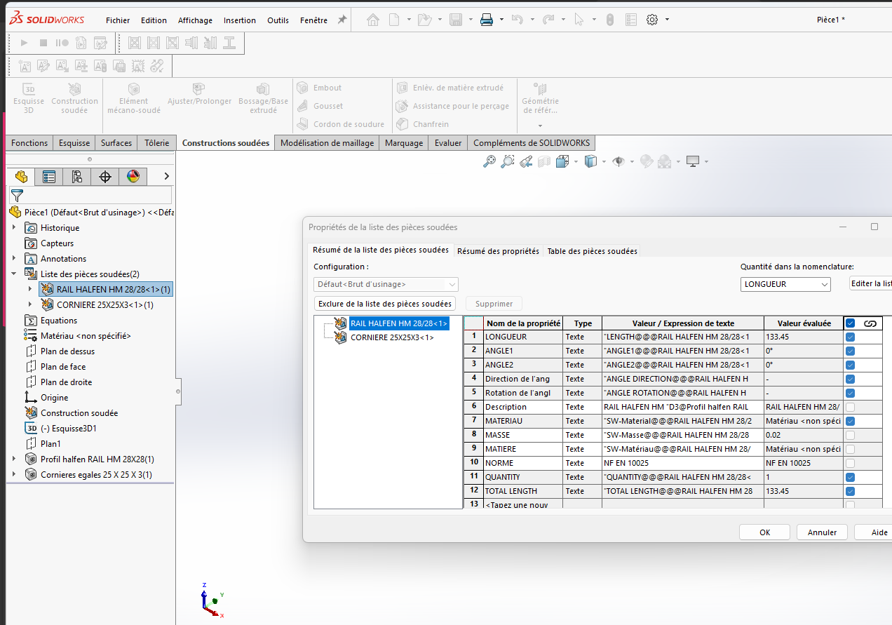 Mon problème : Lorsque je crée un châssis avec des profilés mécano-soudés, la colonne « DESCRIPTION » de ma nomenclature (ou liste des pièces soudées) reste vide dans ma mise en plan. Je suis actuellement obligé d’éditer manuellement les propriétés de chaque article de la liste de coupes pour saisir la désignation.