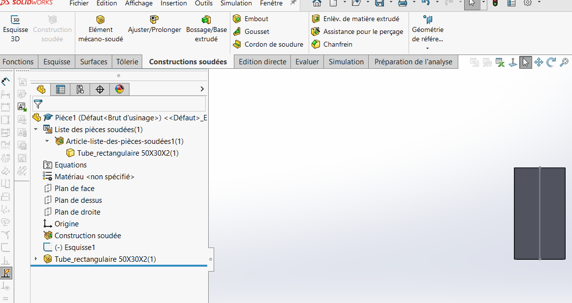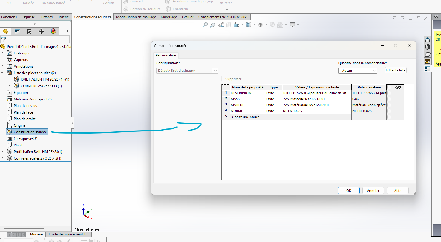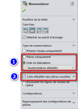 => Il faut que la nomenclature (pièce soudée ) soit en mode « pièce uniquement » ou liste en tabulation" (1)
