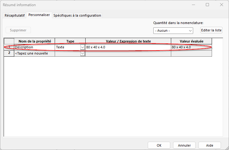 Le contexte : Sur le poste de mon collègue, avec les mêmes profils, le problème n’existe pas : dès qu’il sélectionne un profil (ex: « 40x40x2 »), le nom du fichier est automatiquement repris dans la propriété « Description » de la liste des pièces soudées.