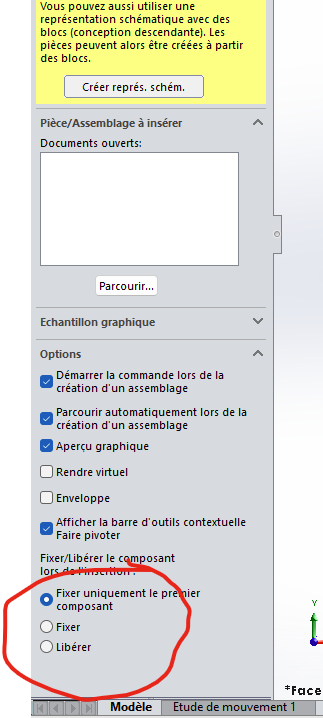 Quand j’insère un composant dans un assemblage, d’office il vient avec le (f) Fixer et je dois toujours le libérer pour lui donner des contraintes.